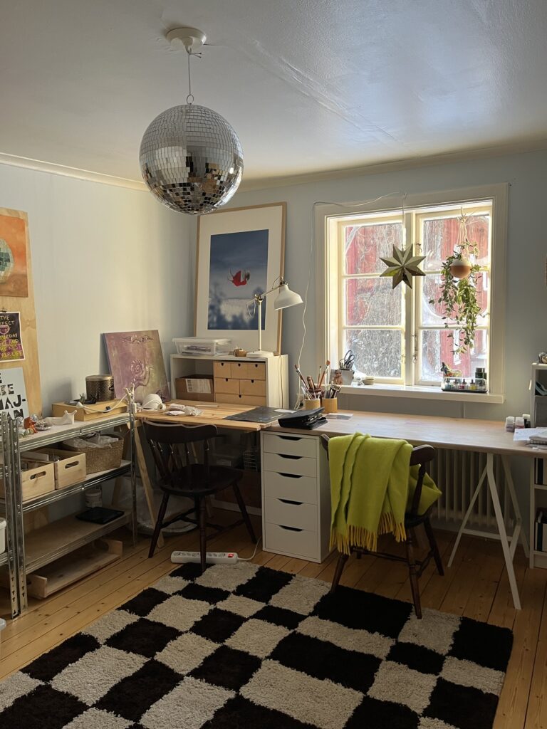 Från abstrakt till konkret: På bilden är min ateljé. Ett rum på övervåningen i huset vi bor i. Ett helt eget rum med enda funktionen att ge mig förutsättningar att skapa och må bra. Jag vet, det är så sjukt jäkla lyxigt att ha. Och innan du stannar i tanken “ja men jag har inte ett helt rum där jag bor, så jag kan inte göra likadant, lika bra att scrolla vidare”, det kan vara något helt annat för dig än ett rum, kanske är det en annan yta eller andra ändringar som ger dig andra förutsättningar än vad du har nu. Så häng med när jag visar min ateljé så kanske du får idéer!