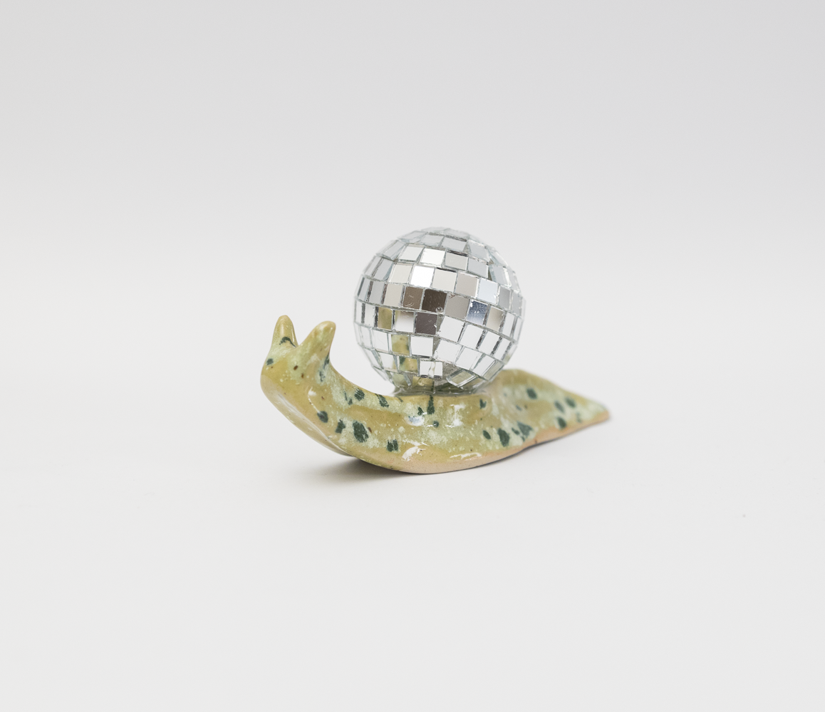 Varje snigel är helt unik i sitt uttryck och färg. Och alla har en inneboende glädjespridare!  Jag gör varje snigel för hand i stengods och monterar sedan discokulan, i min ateljé i Värmland.