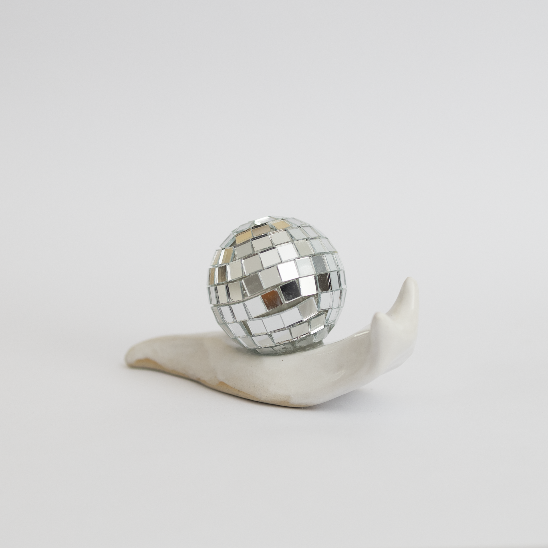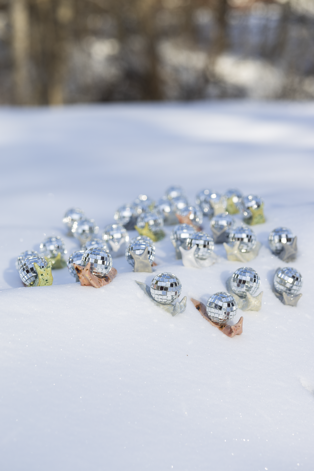 Varje snigel är helt unik i sitt uttryck och färg. Och alla har en inneboende glädjespridare!  Jag gör varje snigel för hand i stengods och monterar sedan discokulan, i min ateljé i Värmland.